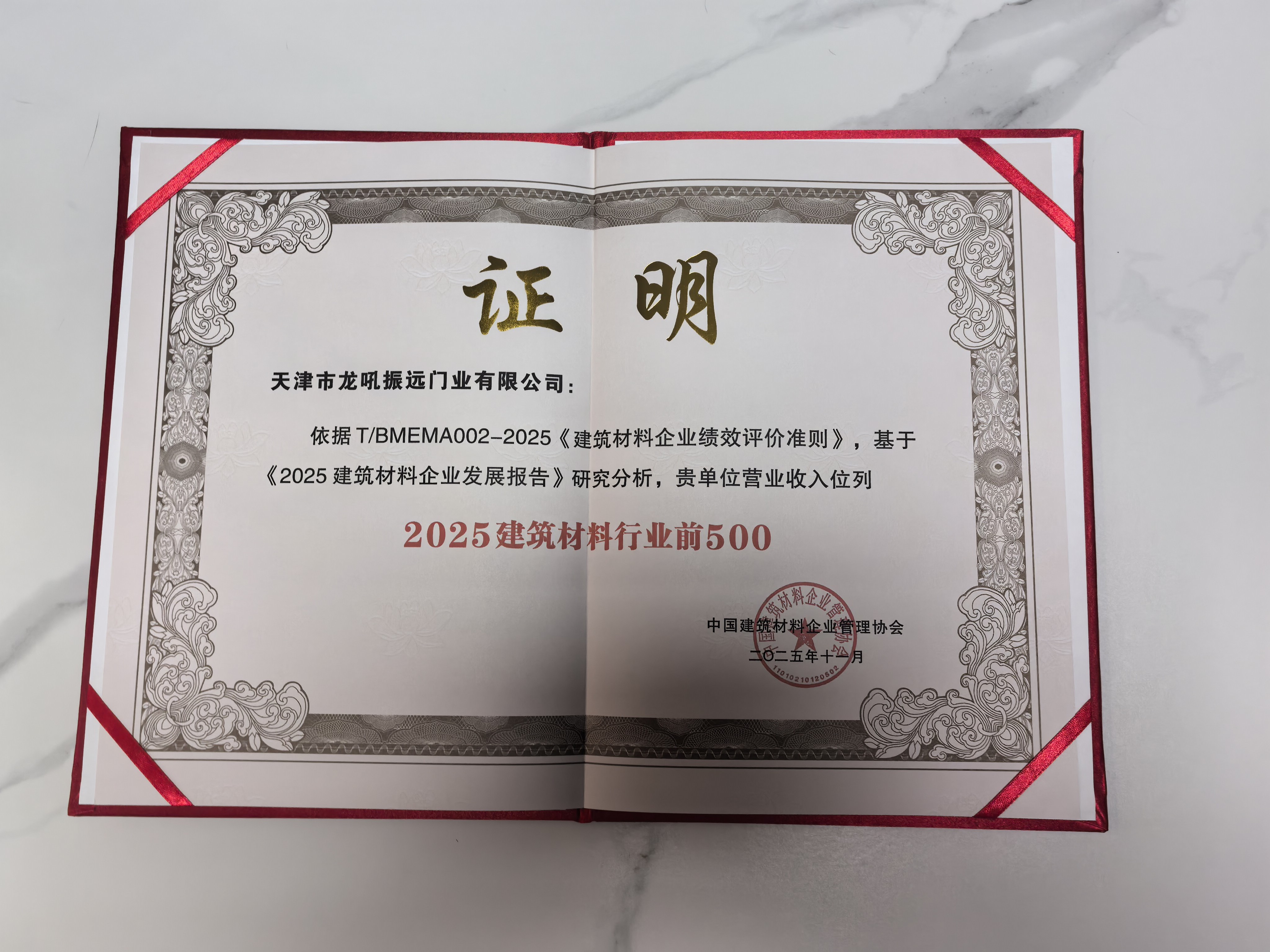 龙犼门业2025年取得门类行业10强荣誉。建材企业500强荣誉,坚定以品质为第一,服务为第一要旨